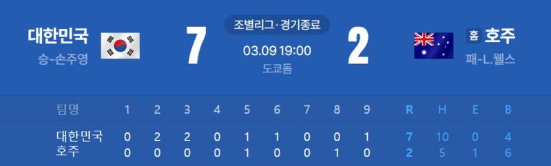 한국은 9일 일본 도쿄돔에서 열린 2026 WBC 조별리그 C조 4차전에서 호주를 7-2로 꺾었다. 이로써 한국은 2승 2패를 기록하며 호주, 대만과 동률을 이뤘지만 세 팀 간 맞대결에서의 최소 실점률에서 앞서 일본(3승)에 이어 조 2위로 8강행 티켓을 확보했다.
