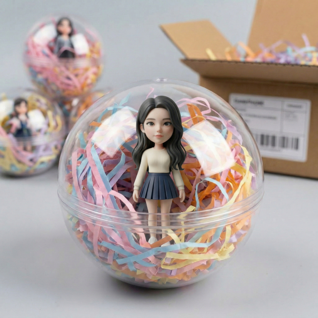 AI 캐릭터 생성 후 제작된 커스텀 피규어 예시(투명 캡슐 패키지