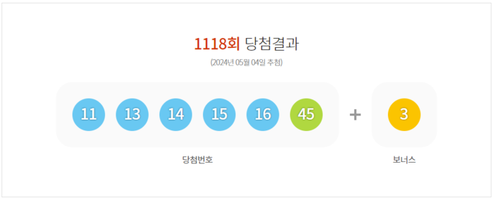 추첨 결과 1등 당첨번호는 '11, 13, 14, 15, 16, 45'이며 1인당 14억 7744만 원씩의 당첨금을 수령한다.